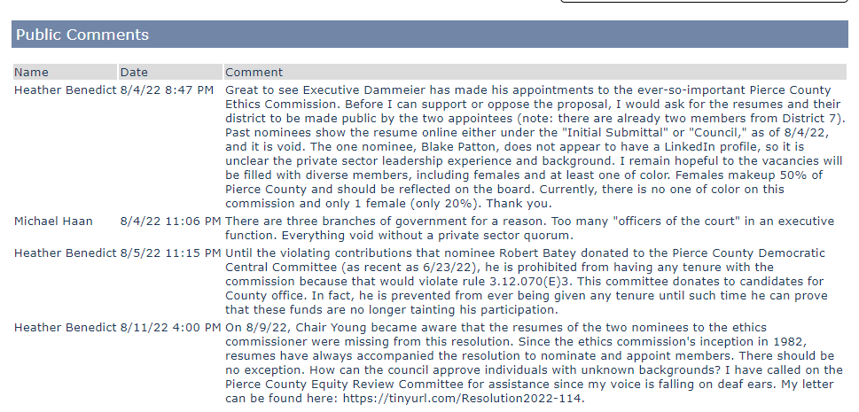 I have raised concerns to County Council and Executive regarding the selection process to fill two vacancies on the Pierce County Ethics Commission. I have received no response from either branch. Thus, my concerns have fallen on deaf ears. Thus, I am reaching out to your organization to comment publicly on the lack of diversity on this commission and the Executive's failure to appoint members with diverse backgrounds. Currently, up for a vote scheduled for 8/16/22 are two nominees in Resolution R2022-114, Blake Patton and Robert Batey. However, the resumes of these two individuals are not made public. My concern is the lack of transparency in the process - the nominees may not be the most experienced, best-suited, and highest qualified nominees and have been selected by Executive Dammeier through his Rolodex and did not make it a fair process. We do not know, but it is questionable that this is happening. For example, Mr. Batey only has one year of private sector experience yet is filling a private sector role; how is only one year of experience in private sector work the most qualified? Nothing is known about Blake Patton; as there is no LinkedIn profile, website, or Facebook page, there is nothing on this individual to understand whether they're qualified for this role and their beliefs on diversity. How can the county council approve the nominations knowing nothing about the nominees? I think being a member of the KKK could be considered the private sector, and as far as I am concerned, this could be Blake Patton's background - we do not know.